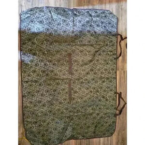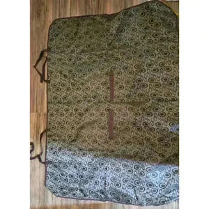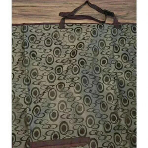 This is a pre-owned backseat car protector. It is made of a water-resistant fabric with a brown and gray interlocking circle pattern. The protector has two adjustable straps with buckles that attach to the headrests. It also has two pockets on the back. The protector measures approximately 54 inches long and 48 inches wide. It is in good condition with no visible tears or stains. The fabric is slightly faded in some areas.