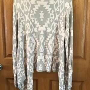 Unbranded Cardigan, Light Pink with grey Pattern, 2X, tapers in front, much shorter in back, No buttons, long sleeve