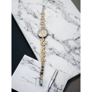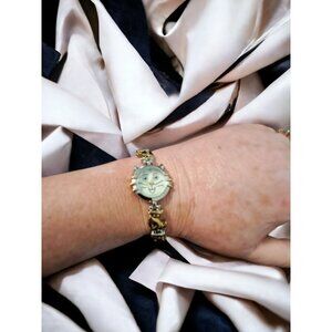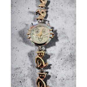 The silver link bracelet adds elegance, with 3 adorable golden cats on each side, making it both stylish and whimsical. Designed to fit wrist sizes from 7 1/2" to 8", this pre-owned watch is in excellent condition, keeps accurate time, and has a brand-new battery installed.