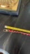 32” length, goldtone with red laced through the chain. Drop length 16”.