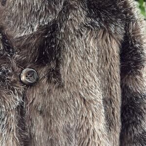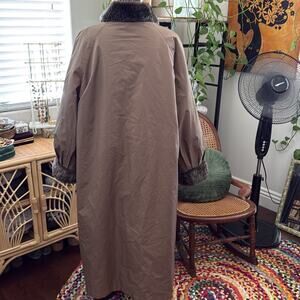 Brown. Reverses to a raincoat. Buttons up on both sides - one button on faux fur side could use a reinforcing - see pic. Has pockets. Made in USA. Imported fabric - likely acrylic. Size 16. Very nice used vintage condition - no rips, tears, or stains. Flat lay measurements are approximate.