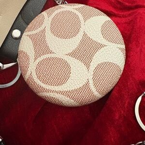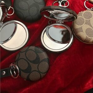 Stylish compact mirror keychains with signature pattern. Available in black, tan, and brown.