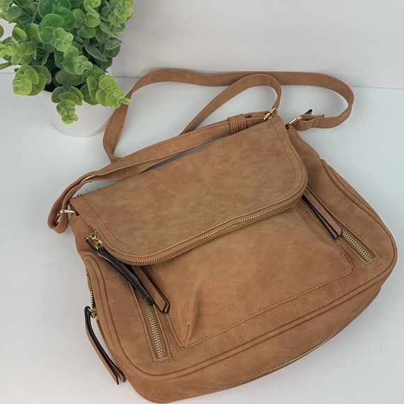 Unbranded Crossbody tan bag with multiple zipper compartments expandable bottom