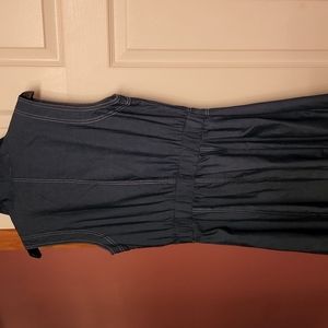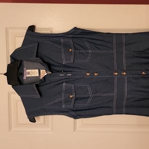 Maxi sleeveless denim dress. Dress has a split in back, copper colored buttons with pockets. 80% cotton 20% poly. Cute!! New with tags!!
