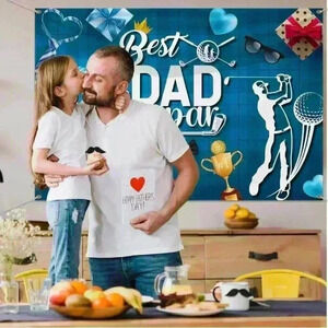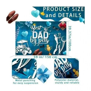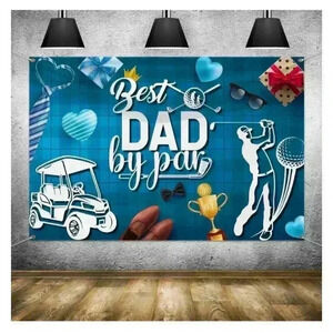 This is a new, unused Father's Day banner with tags and in its original packaging. It features a blue background with a golf-themed design, including a golfer, golf cart, golf clubs, sunglasses, and a trophy. The banner reads "Best Dad by Par" in white lettering. It is made of polyester material and measures 59 inches wide by 39.37 inches tall. The banner has metal punching for easy suspension. It is a great way to celebrate Father's Day and show your dad how much you care.