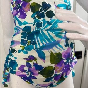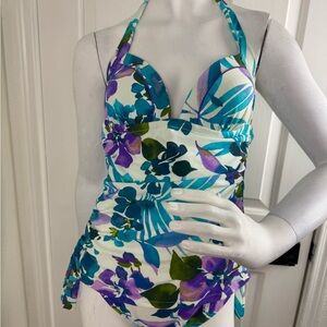 This vibrant kids one piece swimsuit features a beautiful floral design in shades of blue, purple, and green. Perfect for a fun day at the beach or pool in good condition see pictures for measurements since the size tag is missing.