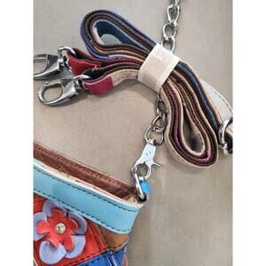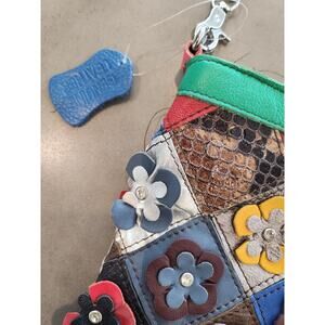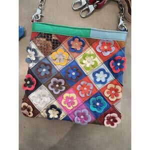 This purse appears to be unused and in perfect condition. 100% genuine leather. Colorful flower patches with layered flower cutouts. Multi color.