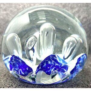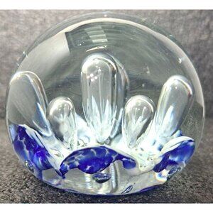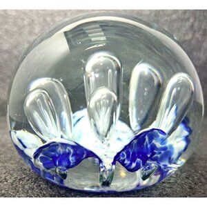 Beautiful clear, blue and white paperweight with controlled bubbles and a polished base. No visible signatures.