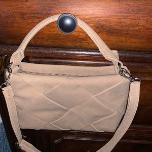 Cute faux suede handbag with adjustable, removable crossbody strap. Zip top.