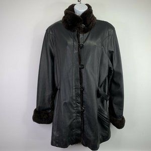 Unbranded Leather Fur Jacket Black Button Front Pockets