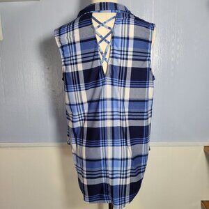 Unbranded Medium Blue White Plaid Collared Sleeveless Button Front Tank Top