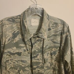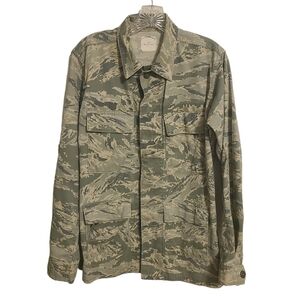 Made expressly for the United States Air Force, this camo shirt jacket is authentic as they come. Size 36 regular vintage camo shirt jacket. Button down shirt jacket has a US Air Force patch on the sleeve and four button pockets in the front. Buttons on wrists. Excellent pre-owned condition; no flaws.
