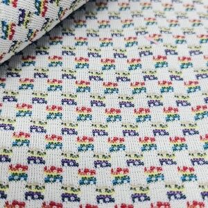 Colorful and cozy. This multicolored blanket is a perfect throw to brighten up any room! This blanket has a rectangular shape and is handmade. Mixed patterns and colors with a small geometric print on the back. Blanket in excellent pre-owned condition overall; threading sticks out in places as part of overall design.