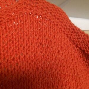 Elevate your wardrobe with this stunning unbranded open knit sweater in a beautiful shade of orange. This pullover sweater features short sleeves and a round neckline, making it the perfect addition to any outfit. The lightweight and breathable fabric of this sweater is perfect for any season, making it a versatile piece that you'll love to wear. Crafted from high-quality acrylic material, this sweater is both durable and comfortable. The solid knit style and open-knit pattern add a unique touch to this vintage-inspired piece. This sweater is pre-owned and available in size L, making it a great addition to any women's wardrobe.