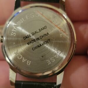 This unbranded quartz wristwatch offers a clean, functional design with a focus on easy readability and everyday versatility. The sleek black dial features large white numerals at the 12, 3, 6, and 9 positions, paired with thick bar markers that make the time easy to read at a glance. A silver-tone case frames the dial with a simple, classic profile, while the black faux leather strap adds a traditional touch suitable for both casual and business-casual wear. The watch is powered by a battery-operated quartz movement for reliable, low-maintenance timekeeping. The case back is marked “Stainless Steel Back – Case, Dial, Band Made in China – China Movt,” noting its construction and origin. With no visible branding and a straightforward layout, this watch is an affordable, practical choice for anyone seeking a minimalist timepiece that delivers dependable function without unnecessary extras.