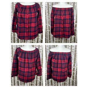 Unbranded Red & Navy Soft Convertible Button Front Flannel Shirt sz L. Features 100% cotton super soft flannel in red & navy blue plaid, faux button front panel, elasticized neckline that can be worn on or off the shoulders (convertible), single button closure on cuffs, curved hemline. Gently worn and laundered with some small pulls in fabric (see pics). This is great top to pair with jeans and boots!