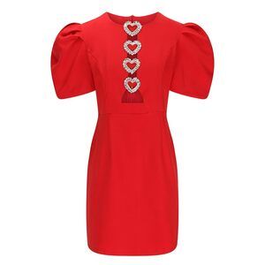 Unbranded Red Rhinestone Heart Embellished Short Puff Sleeve Dress Womens Large