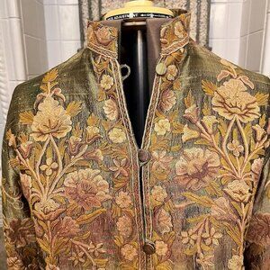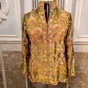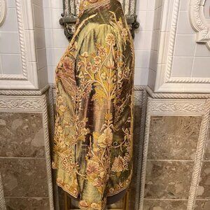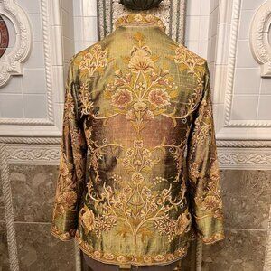 Unbranded. Size Large. Highly Embellished. Embroidered Asian Tunic Jacket. Green Tan. Satin Lined. No fiber or care labels. Shoulder to hem 26.5". Sleeve 22". Bust 20/40".