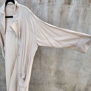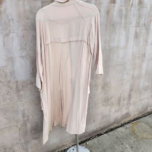 tan with a hint of blush pink summer lightweight trenchnstyle coat jacket. fabric unknown but feels like lyocell/ rayon. has good drape. Preloved condition. All sections of interest as well any known flaws have been documented in the photos and noted as thoroughly as possible. if there are no known flaws, none will be noted. Please feel free to ask any questions before purchase 🙂. does not have or ever had a belt. best fits loose medium or standard large