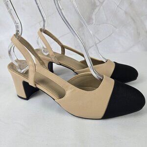 Unbranded Sz 39(US 8.5) Cream Slingback Heels Black Toe Cap Almond Toe