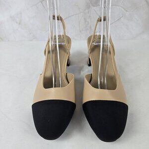 Slingback heels are cream with a black textile almond shaped toe cap. Elastic on the inside of the strap for a comfortable fit. 2.5" heel. Neutral, classic and classy.