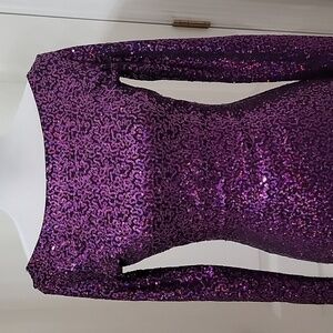 Unbranded Unsized Purple Sequin Bodycon Mini Dress, Back Zipper Closure. Excellent Used Condition. No Holes, Rips, Stains or Snags. Long Sleeve Mini Dress with Low Back. Please refer to measurements in photos to ensure proper fit as there are no tags on this item. Shown on size 6 mannequin.