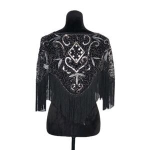 This unbranded vintage black mesh sheer shawl wrap is adorned with floral pattern, beadwork, and sequins, giving it a retro and elegant look. Made from polyester material, this multifunctional shawl features fringe accents and is designed for hand wash only. Perfect for adding a touch of sophistication to any outfit, this shawl/cape style piece can be worn in various ways even as a skirt to suit different occasions, making it a versatile and timeless accessory for women.