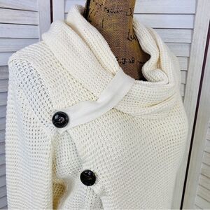 Chunky waffle knit, Light cream color, Faux wrap split front, Rolled cowl neck, Strap & button detail, Long sleeve, Below hip tunic length, 100% cotton