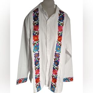 Beautiful unbranded white button-front blouse with vibrant multicolor floral embroidery along the front panels and cuffs. With a relaxed fit, making it perfect for boho, festival, or casual everyday wear. Easy to style with jeans, skirts, or layered over dresses for a unique artisanal touch.