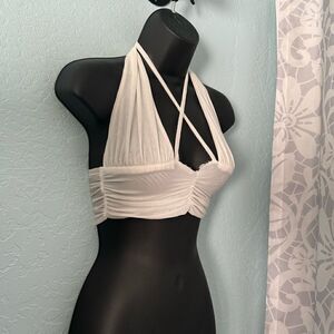 Cute white strappy semi sheer cropped halter top. Plunge neckline. Ruched front & sides. The item has double fabric & seam has parted at front chest. Easy fix with needle & thread or slight tuck. See last photo for details. Brand & size tags have been removed. Fits xs/small best but does have stretch to it. Unbranded Size Small
