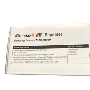 Unbranded Wireless-N WiFi Repeater New In Box Never Used; More range for every WLAN network; Router Downstairs, computer Upstairs? NIB; I never used this, recently moved across country and no longer needed it; Pre-owned; Like New Condition, NIB; Never Used; See all photos for condition & descriptions; Ships Quickly, Monday - Friday (Except National Holidays); 9 oz. L113