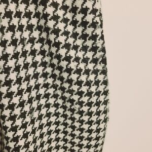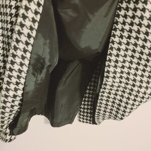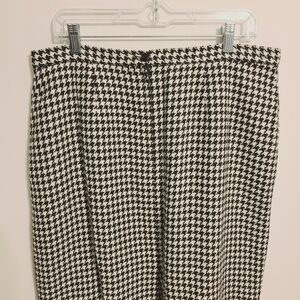 Women's vintage, wool blend, white and black houndstooth printed pencil skirt. No brand tag. Size 18. Lined in nylon. Skirt has side slant pockets and a hidden back zipper with a button closure. Excellent pre-owned vintage condition; no flaws.