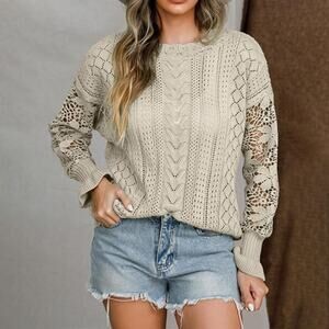 Unbranded Womens beige Crochet Lack Drop Shoulder Pointelle Knit Sweater small