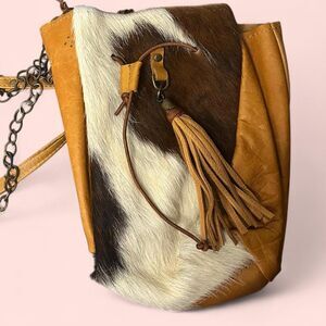 leather bag, cowhide print, faux fur accents, tassel detail, boho style, western aesthetic, two-piece set, discount bundle