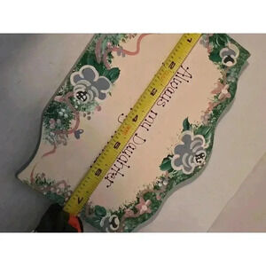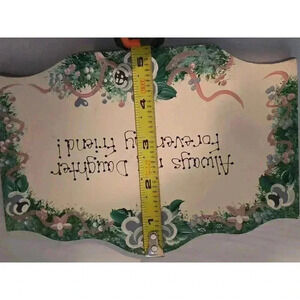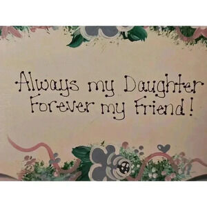 This is a pre-owned wooden sign with a wavy top edge. It is painted white with a green, pink, and blue floral design around the edges. The sign reads "Always my Daughter Forever my Friend!" in black paint. The sign measures approximately 5.5 inches tall and 7 inches wide. The sign is in good condition with no visible damage or imperfections. It is made of wood and has a smooth, painted surface. The sign is suitable for hanging on a wall or displaying on a shelf.