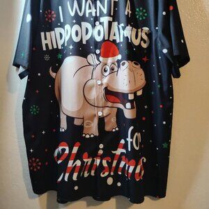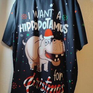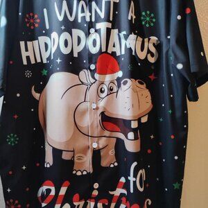 Unbranded XL "I want a hippopotamus for Christmas" Short Sleeve Button Up Shirt. 100% Polyester, 1 Front Pocket. Measures 23" armpit to armpit and 29" in length.