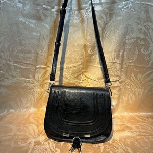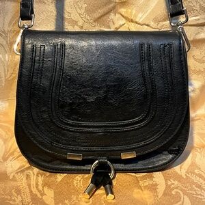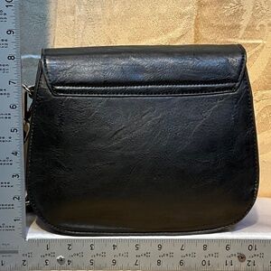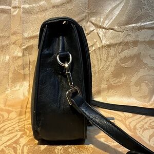 Un-branded black flap bag. Has an adjustable shoulder/ crossbody strap. Closure has a snap closure. Hardware is silver toned, with other silver detailing. It also has a zipper pockets inside.