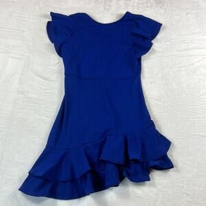 Fitted dress with nice amount of stretch. Features asymmetrical double ruffled hem and ruffled sleeves. No pockets, and has back zip closure.