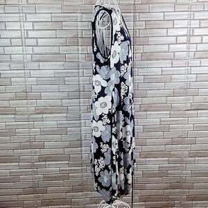 Summer sleeveless dress in navy with large white textured floral print. Pullover design with a v-neck and a strappy criss-cross pattern in the back to an a-line skirt with a scarf hemline. Super cute and in great pre-owned condition.