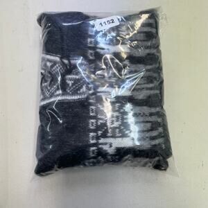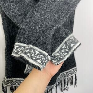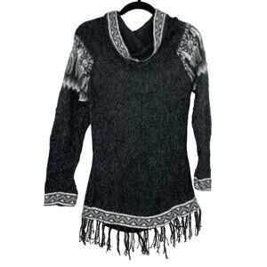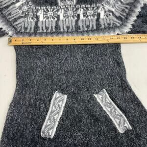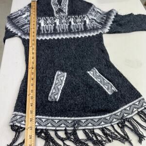 In good preowned condition, two spots where thread has become undone and created holes. Easy fix. No size, brand or fabric tag. Fabric is soft knit. See measurements to guide your fit. Estimating size XS/S. Can be worn as a mini dress or tunic depending on your preference. Animal print, alpaca, tribal, winter, warm.