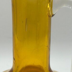 Elegant hand-blown amber glass pitcher with a clear handle, perfect for adding a touch of artistry to your table. Its compact 4-inch size makes it ideal for serving small portions or as a decorative piece. A versatile and stylish addition for any occasion. Comes from a smoke free home.