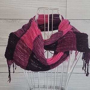 Add a little color to your outfit with this lightweight scarf in pink and black with fringe. Great pre-owned condition. Overall length 56"