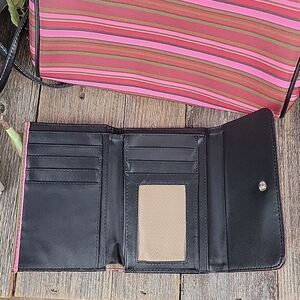 10"X6" one compartment crossbody bag with one inside zipper pocket and matching wallet. A tri fold wallet with 6 credit card slots and ID and bill holder. Great pre-owned condition