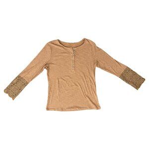This Unbranded Women's Pullover Top in size XL features a stylish beige/peach hue with delicate lace detail. The long sleeves and 1/4 button design add a cozy, chic touch to any outfit.