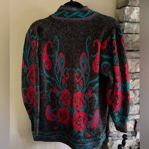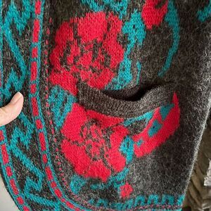 Unbranded wool cardigan with floral pattern, two front pockets, ribbed cuffs. Open closure. Gray with red and green floral accents. No size or material tags but seems to be wool or wool blend and approximately a size M.