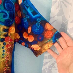 Pretty multicolored abstract print v-neck T-shirt. No brand tags. Front chest pocket. Lightweight cotton/Polyester fabric. In excellent condition. Unbranded Size Small