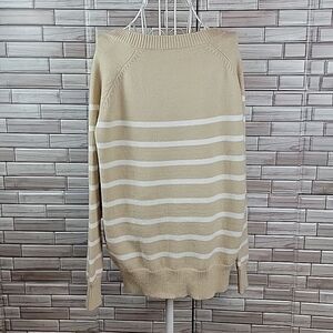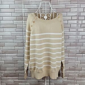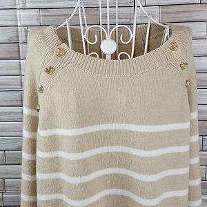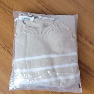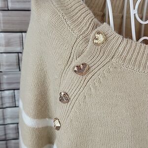 Acrylic nylon polyester blend knit pullover sweater. Crewneck, ribbed cuffs and hemline and 3 gold heart button detail on each shoulder. Never worn. I opened bag for pictures.