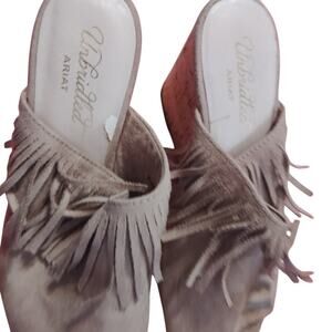 Unbridled Ariat Fringe Cork Mule 4" tan slip on heels Sz 7 good condition