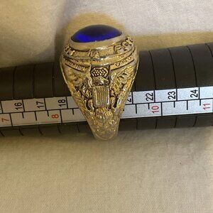 Design: Classic high school ring with a central blue stone (~8-10mm) and side crests, no year or school specified