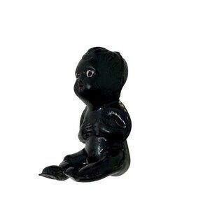 Rare complete 1930s Uncas toy ring set with cat-themed box, original insert, etched ring, and miniature Black composition doll. Marked with U.S. Patent 1,643,421 and Uncas hallmark, this charming collector’s piece displays beautifully and is hard to find intact.